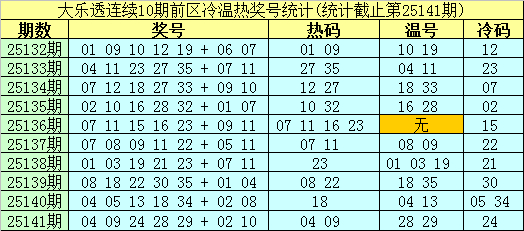 大乐透第25132期-第25141期前区奖号冷温热踱步统计: